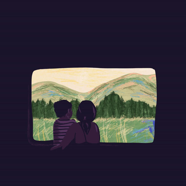 This piece was created in two sections, firstly the window still, picturing siblings looking out the train window, inspired by a beautiful video from Tom Roshenthal. I drew a long scene of a changing landscape and used after effects to move through the landscape. I have included initial sketches and colour development within my work.